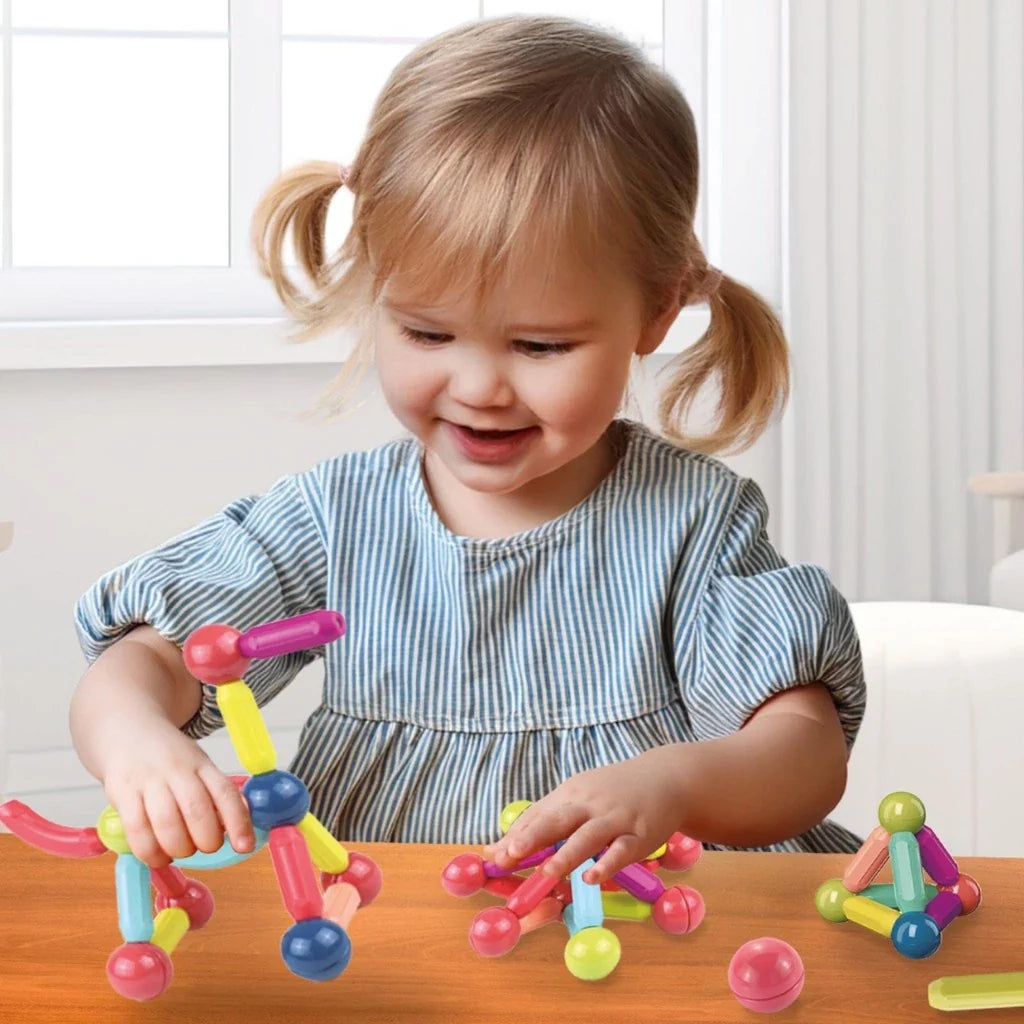Com ímãs de alta qualidade, os blocos se conectam com firmeza, facilitando a criação de diversas estruturas e formas geométricas. Cada peça é feita de material seguro e durável, com bordas arredondadas, perfeito para o manuseio infantil.
